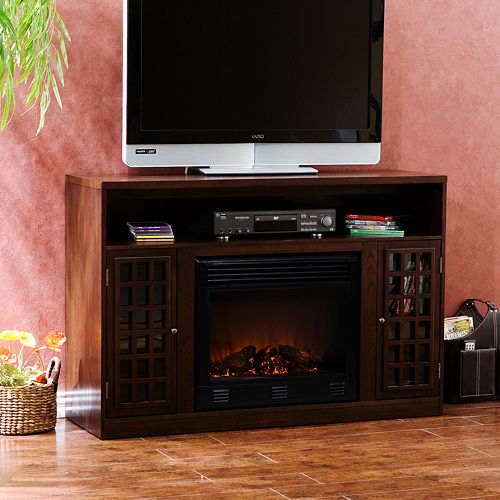 Tv & media stands, mantel packages. Made of hardwood veneered mdf, the media console can accommodate flat screen tvs up to 60, and offers plenty of storage space. 58 wood highboy fireplace media tv stand console. Dimplex jesse 65 inch wide media console with 5118 btu electric fireplace and reversible chalk board cabinet doors. Media console infrared electric fireplace in warm brown with espresso top bring family and friends together with the bring family and friends together with the 63 in.